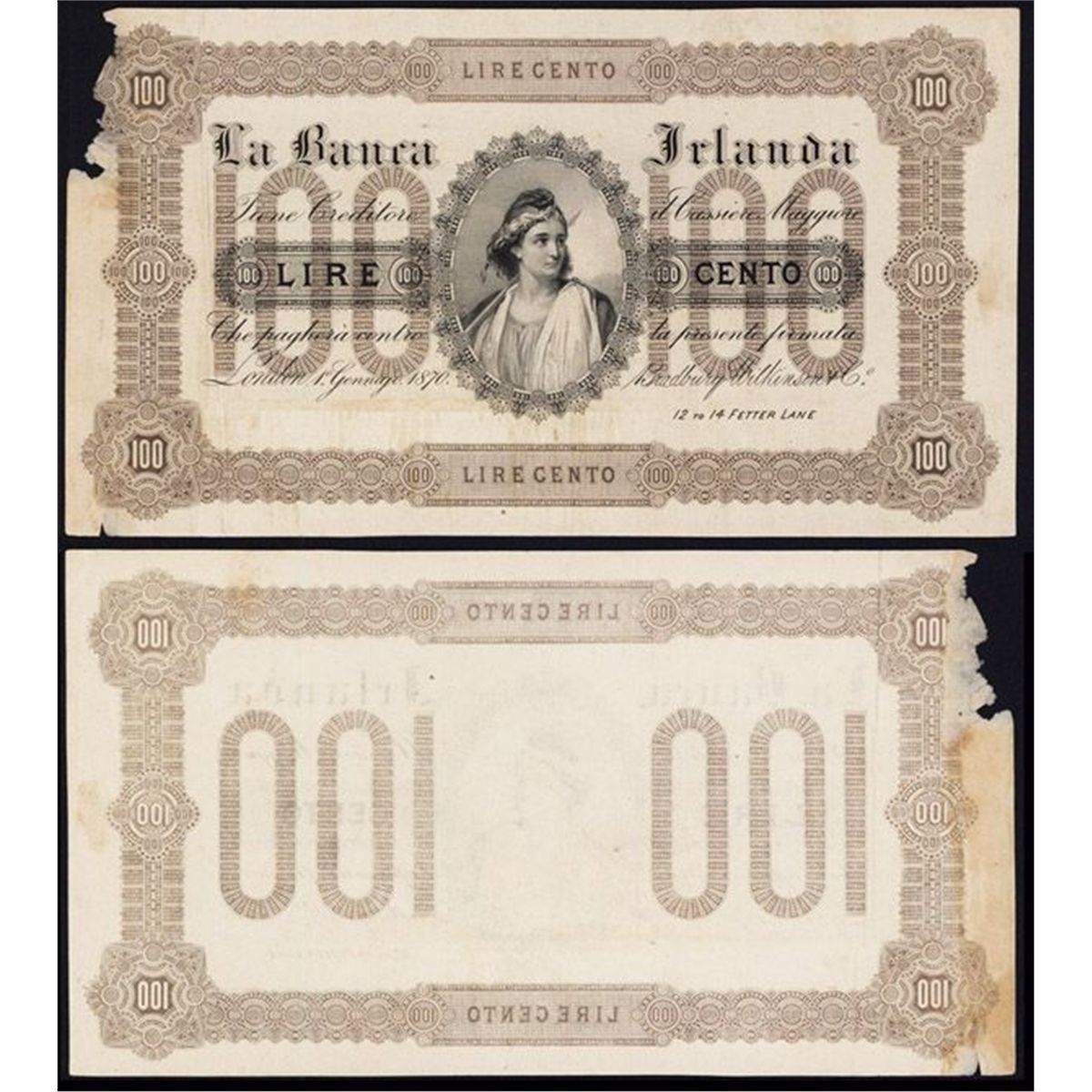 Great Britain - Italy - Argentina, 1 Jan 1870, 100 Lire, P.unl., 'La Banca Irlanda', attractive advertising note. 'La Banca Irlanda' is the 'Bank of Ireland', but the note is inscribed almost entirely in Italian, and bears the design of a contemporary note issued for Argentina. Specimen note in black and brown, the upper left corner torn. Portrait of Liberty in center, Rare large size early Security Printer Advertising Banknote, BWC.