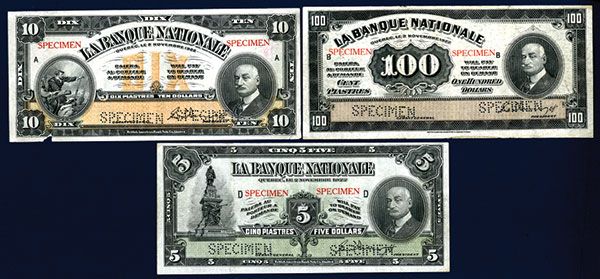 Quebec, Canada, Lot of 3 notes, includes $5, P-S871, Choice VF to XF; $10, P-S872, XF with a small chip out of the bottom middle margin and small tear on lower right margin; and $100, P-S875, Choice VF, all with red Specimen overprints and pin-punch Specimen overprints, BABNC.