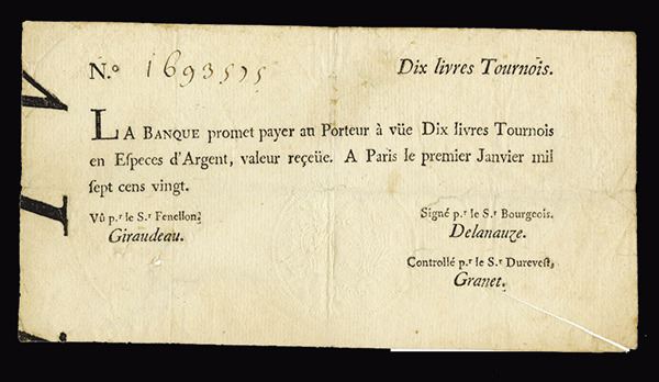 France, issued note, 10 Livres, 1720, P-A20a, uniface. Very Fine with a 1.5 inch slit in the paper on the lower right corner, possibly for canceling. Popular issue used in the New World.