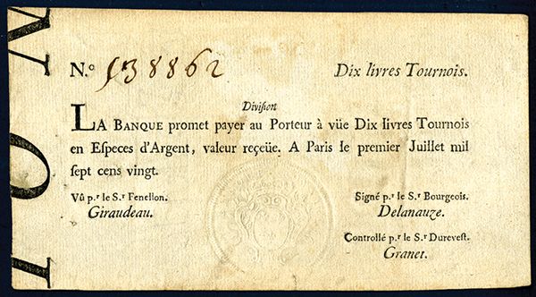 La Banque (Royale), January 1, 1720, John Law Paper Currency Note Mississippi and France, 1720, 100 Livres, P-A16b, with text "Especes d'Argent", Printed on watermarked "Billet de Banque" laid paper, 160 by 85 mm, Uniface, typeset text, embossed bank seal on lower left, S/N 138862. Folded twice vertically lightly, VF to XF condition with 6 small pin holes on the bottom middle. Historic John Law banknote.
