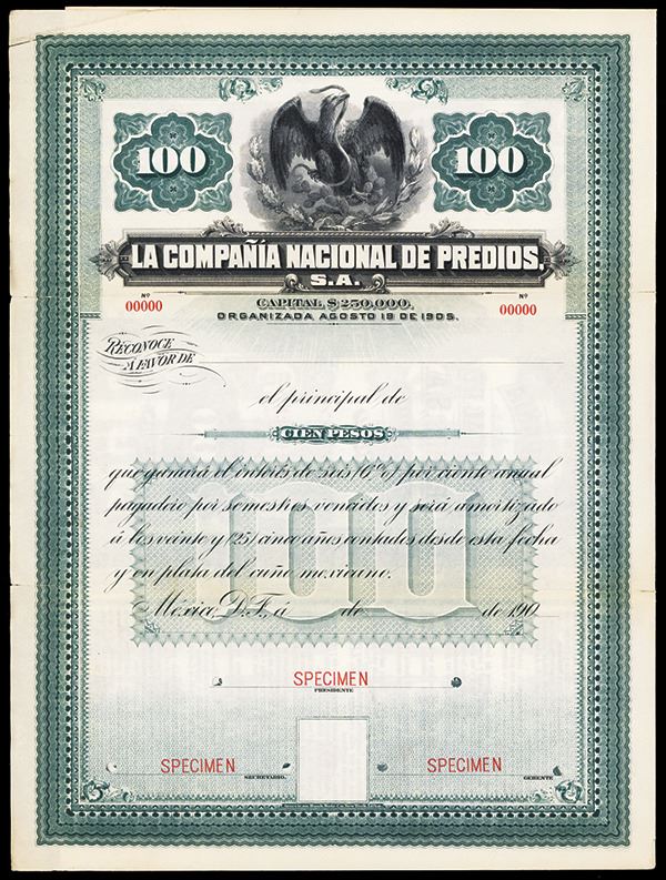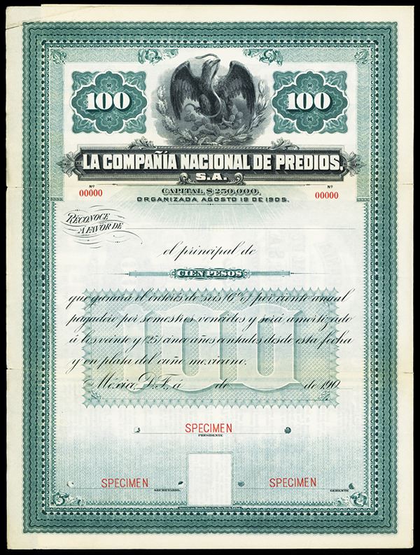 Mexico. $1000 Specimen 6% Bond. Black ink with green border and under print. Vignette of the Coat of Arms of Mexico at top center of certificate. All coupons attached. Specimen overprints, POC's, XF Condition with slight splitting along fold lines. ABNC.