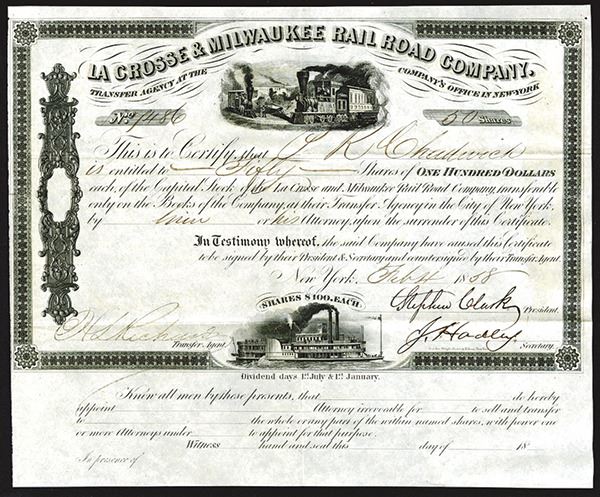 Wisconsin, 1858, 50 Shares, Issued and uncancelled stock certificate, top middle with two locomotives, bottom with steamboat, VF-XF condition, Attractive certificate. RWH&E.