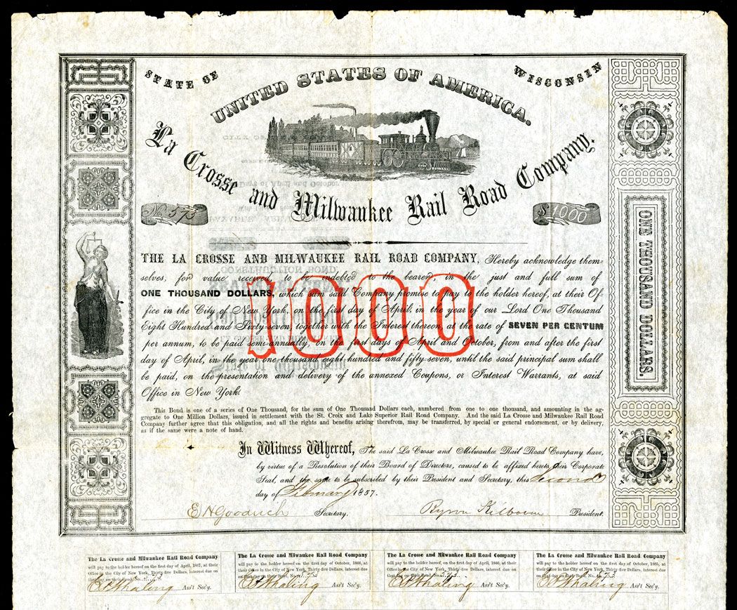 $1000, 7% construction bond, Locomotive L-R on top, justice on left, red 1000 Underprint, VF with minor edge faults in excess border. Scarce early Wisconsin railroad.
