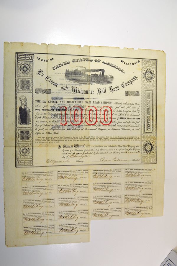 $1000, 7% construction bond, Locomotive L-R on top, justice on left, red 1000 Underprint, VF with minor edge faults in excess border. Scarce early Wisconsin railroad.