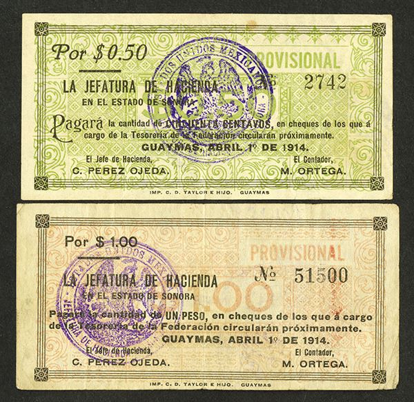 Mexico, Revolutionary. Sonora. 50 Centavos, 1 Peso. SCWPM S1056, S1057. Large purple hand stamp on each. The first with some paper tone. Both a nice Very Fine. 2 pieces.