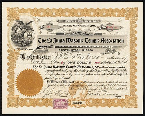 Colorado, 1902, 1 Share, Issued Stock, Black print with gold border and underprint, Allegorical figure with Colorado Arms top left, VF condition.