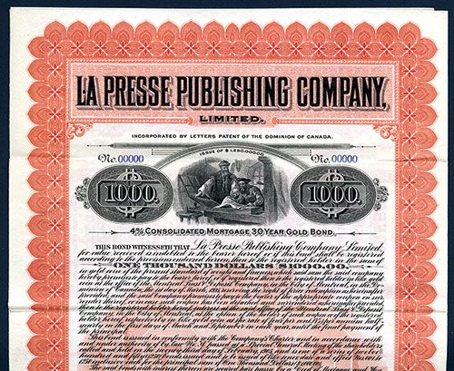 Montreal. 1905. $1000 4% Gold Bond. Red border and undertint. Vignette of printers with antique printing press (probably Guttenberg). POC. Coupons attached. XF condition. ABNC-Ottawa.