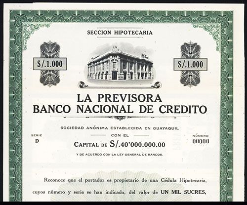 Ecuador, 19xx, 1000 Sucres, Specimen Bond, Black on green border and underprint, Photo of the bank top center, VF-XF condition, ABNC.