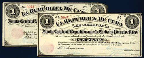New York, NY, August 17, 1869. Cuba and Puerto Rico, Lot of 2 notes, both are 1 Peso, P-61, Issued banknotes, Black with red seal, S/N's 5972 and 5987, both are AU, one with upper right corner tip missing and the second with light edge toning and a small ink burn in middle. Issued by a Revolutionary group in New York City.