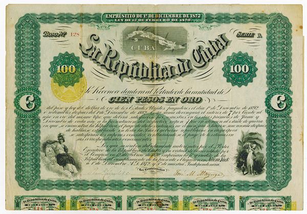New York and Cuba. 1872. 100 Pesos, 7% Issued bond, "Emprestito De 1 De Diciembre de 1872 - Ley De 12 De Febrero De 1870", Black on green underprint and border, Map of Cuba on top middle, allegorical women on lower left and right, yellow seal on left middle, coupons attached, Cert.# 128, overall the bond appears VF to almost XF condition with bright colors and only light toning in spots and a vertical fold line in middle keeping this from XF. CBNC. Rare and early Cuba bond.