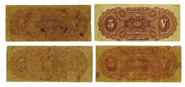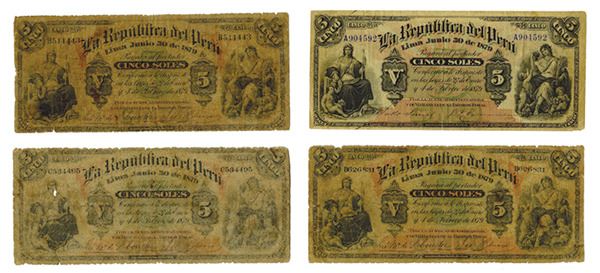 Peru, Lot of 4 banknotes, All are 5 Soles notes, Includes 3 examples of P-3, with small 16mm size "5" in middle, all in Good to VG condition with wear, minor edge tears and one with a small 2mm hole at left, 2 have prefix "B" with different size serial numbers and one with Series "C"; there is a single example of P-4, with 20.5mm size "5" in middle VF condition with 2 stamp hinged on back that can be soaked off, a small3 mm split on the bottom vertical middle margin and 2 small pin holes on the left side of the note. ABNC. (4).