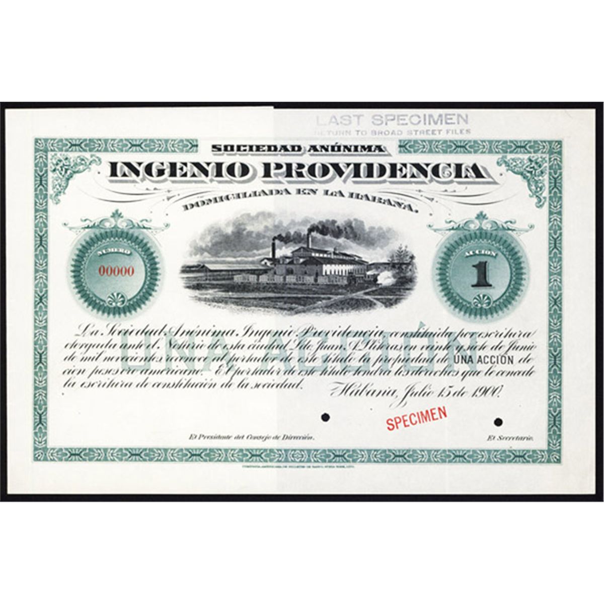 Havana, Cuba, 1900, 1 Share, Specimen stock, black and green, Specimen overprints, POC's, XF-AU condition. Sugar factory with locomotive in front, ABNC.