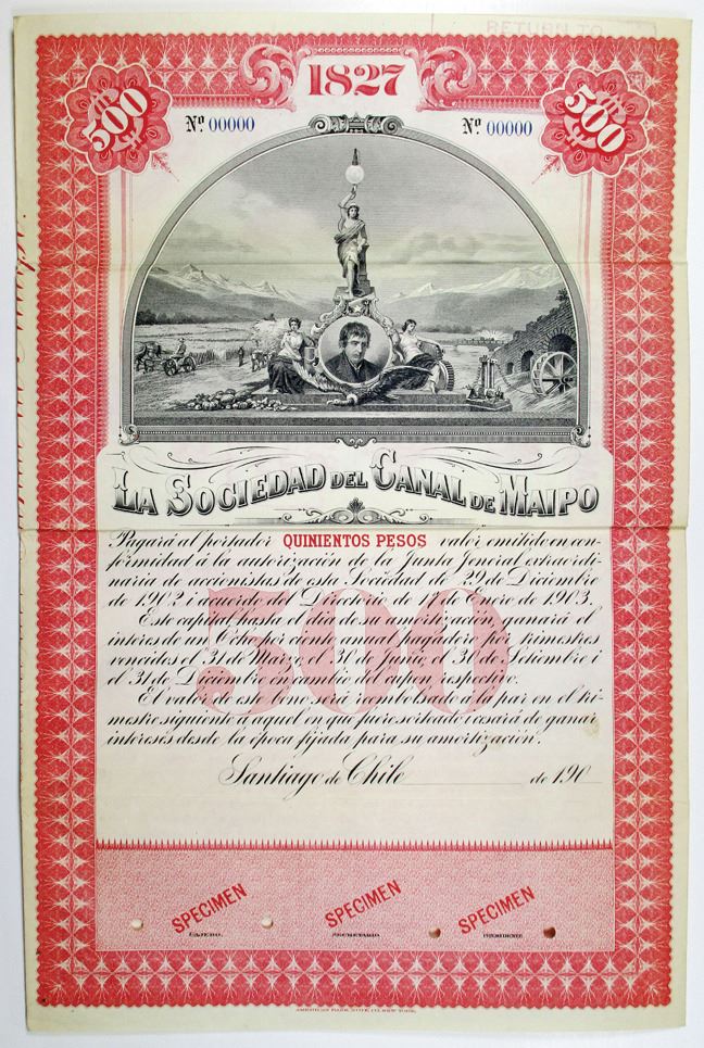 Santiago, Chile, 1900's. 500 Pesos Specimen 8% Coupon Bond in Spanish, Black text with red border and underprint, Trio of allegorical women flank portrait of a man with scenic background at top center. Return to Issue Room stamp at top right corner, POCs. Fine-VF condition, ABNC.