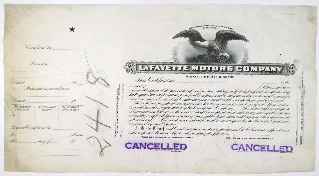 Indiana and Wisconsin (Inc. in Delaware), ND (1919). Odd Shares Progress Proof Stock Certificate, Black text on off-white paper, Eagle at top center. Writing at left, Cancelled stamps at bottom. Fine condition. The LaFayette Motors Corporation was a United States-based automobile manufacturer. Founded in 1919, LaFayette Motors was named in honor of the Marquis de la Fayette, and LaFayette autos had a cameo of the Marquis as their logo. LaFayette was originally headquartered in Mars Hill, Indianapolis, Indiana, and made luxury motor cars, beginning in 1920. LaFayette innovations include the first electric clock in an auto. In 1921, Charles W. Nash became president of LaFayette. Nash was already president of Nash Motors, but for a time the two brands remained separate companies. In 1924, Nash Motors became full owner of LaFayette Motors, and the name was retired soon after. Its factories were quickly put to a new, more profitable use: the manufacture of Ajax motor cars. Rare Progress Proof Stock Certificate.