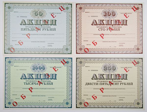 Russia. Lot includes a quartet of specimen share certificates, in denominations of 50, 100, 250, and 1000 Rubles, all with the same design but different colors, and all overprinted OBRAZETS ("specimen" in Russian), s/n AA0000000, no specific organization or location mentioned aside from the generic "Trudovoi Kollektiv" (labor collective). Unc. (4)
