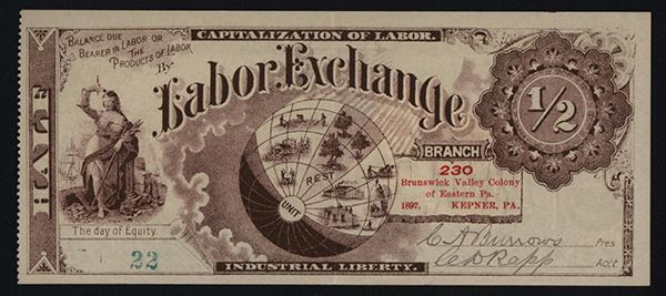 Kepner, Pennsylvania, 1897, 1/2 denomination, Issued and uncancelled, "230 Brunswick Valley Colony of Eastern, PA - 1897 - Kepner, PA" in small type in red, Brown on light brown, allegorical blind justice on left with globe in middle, back green with locomotive, image with political (Socialist) overtones, XF to AU condition with one light vertical fold keeping this from Unc. Scarce scrip note.