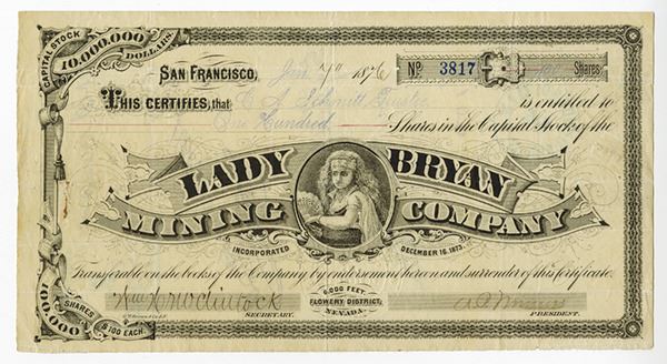 Nevada, 100 Shares, I/U Black without underprint, young woman in middle flanked by ornate title, S/N 3817, ornate border, Attractive and scarce. Mines located in the Flowery District, Nevada. Fine to VF with toning and small pin holes at left.