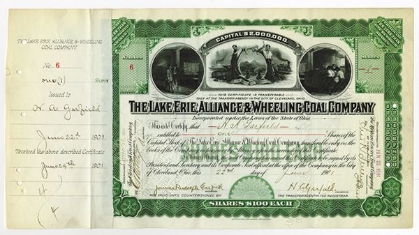 Ohio. 1 Share, I/C, Black on green underprint, Ohio arms center flanked by men on with coal cars on left and right, S/N 6, ITASB H.A. Garfield as president and signed by his brother J.R. Garfield as secretary. Scarce signature on attractive stock certificate. VF ABNC. H.A. Garfield received a law degree from Columbia Law School in 1888. He practiced law in partnership with his brother James in Cleveland, Ohio, 1888-1895. He served as Trustee and Professor of Contracts at Western Reserve Law School, 1891-1897 and Professor of Politics at Princeton University, 1903-1908. Garfield became the eighth President of Williams College and served until his retirement in June 1934.