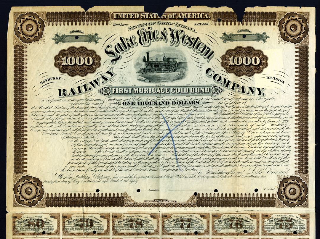 Ohio. Indiana. 1880. $1000. Specimen 1st Mortgage 6% Gold Coupon Bond. Horizontal format, Brown border. Train R-L in middle, POC's. Coupons attached. Fine condition with small pieces missing from the top middle and right margins and "X" crayon cancellation in middle. Rare bond and possibly unique with only one similar appearing but different date reported in Cox. Franklin BNC.