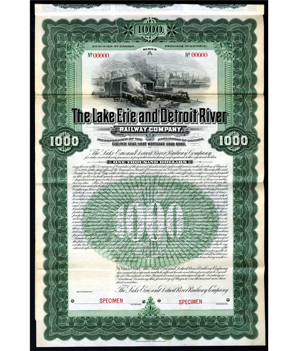 Ontario, Canada. 1902, $1000, 5% 1st Mortgage Gold Bond Specimen. Green border and undertint. Trains at harbor pier with steamships in background. Coupons attached. XF condition. ABNC. Unlisted railroad in Cox. Another rare and very attractive railroad bond.