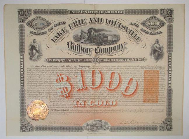 Ohio & Indiana, 1872. $1000 I/U 7% First Mortgage Gold Bond, Black print with a peach underprint, Multiple vignettes on certificate including a locomotive passing ships and allegorical women, S/N 228, IR RN-W2 on right. VF condition with archivally reinforced vertical folds and small tears, with coupons attached and a gold foil seal. Homer Lee & Co., Sold "As Is", not returns accepted.
