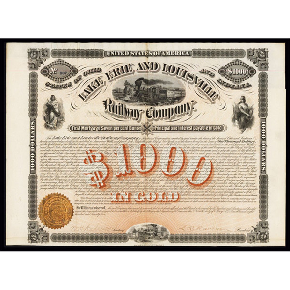 Ohio and Indiana, 1880, $1000, Issued and uncancelled 1st Mortgage 7% Gold Bond. Black on peach underprint with locomotive R-L passing ship and small train with allegorical women on left and right and small train at station on bottom, coupons attached, gold foil seal, XF condition, Homer Lee & Co.