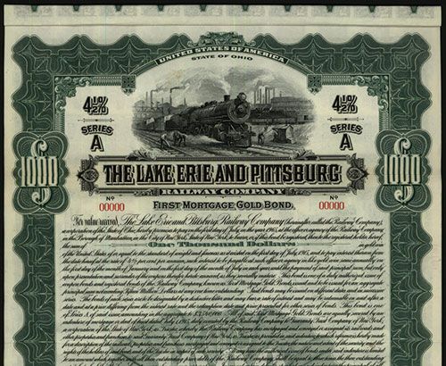 Ohio, 1915, $1000, 4 1/2% Series A 1st Mortgage Gold Specimen Bond, Vertical format, Coupons attached, Black on green border and underprint, Vignette of locomotive and railway yard workers, POC's, ABNC. Railroad is listed in Cox but not this Series of Bond.