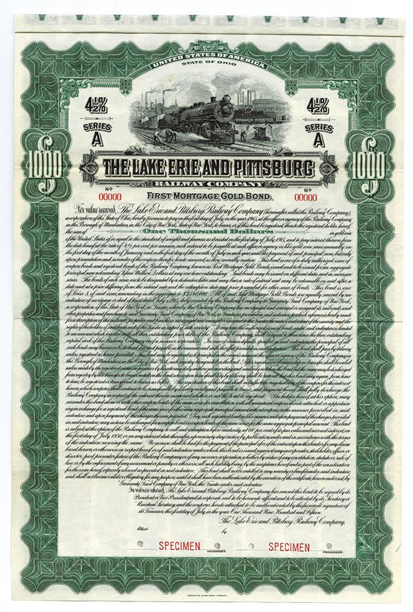 Ohio, 1915, $1000, 4 1/2% Series A 1st Mortgage Gold Specimen Bond, Vertical format, Coupons attached, Black on green border and underprint, Vignette of locomotive and railway yard workers, POC's, ABNC. Railroad is listed in Cox but not this Series of Bond.