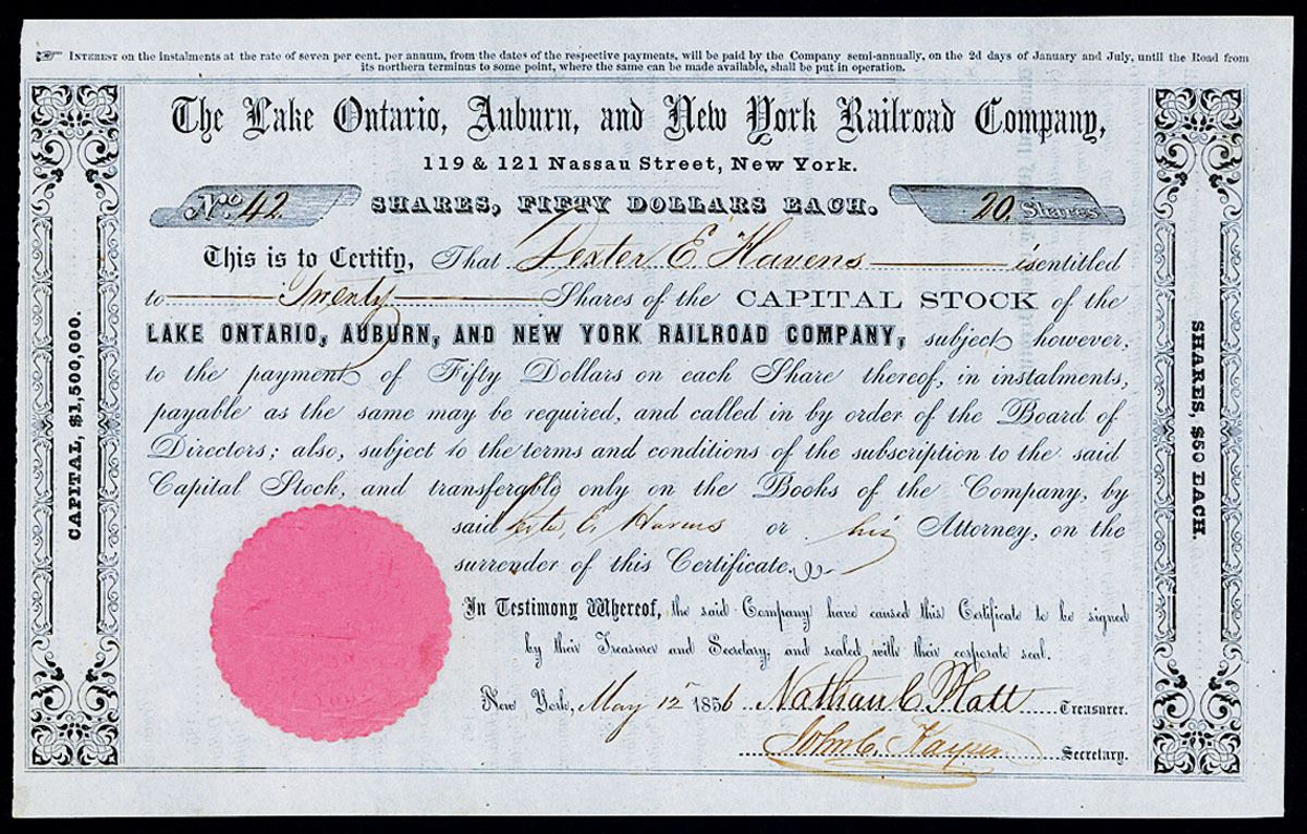 New York, 1856, 20 Shares I/U Stock certificate, Black text, Blue Paper, Pink seal, VF-XF.
