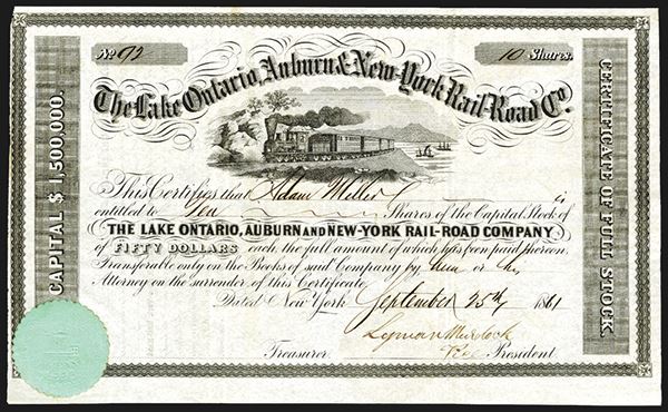 New York, NY. 1861. 10 Shs. Issued and uncancelled (no secretarial signature, but vice-president and corporate seal present). Green seal. Certificate #92. Locomotive R-L around curve with lake in background. VF+ condition. Rare railroad stock with 4 found in an old estate 10 years ago.