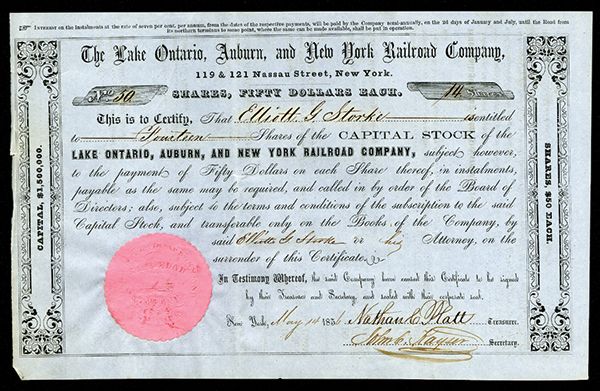 Lake Ontario, Auburn and New York Railroad Company Stock Certificate- Subscription Agreement New York, NY. 1856. 14 Shs. Issued and uncancelled. No vignette, black printing on light blue paper. Red seal. Certificate #50. VF condition. One of 5 certificates found 10 years ago in an old estate.