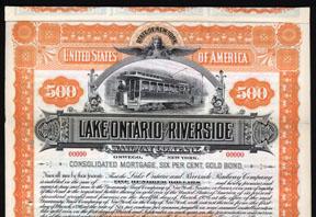 Oswego, New York, 1896, $500. 6% Consolidated Mortgage Gold Bond. Orange border and undertint w/ trolley vignette. ABNCo. Litho specimen w/ coupons, XF, Very attractive and scarce.