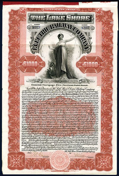 Ohio, 1903. 1000, I/U General Mortgage 5% Gold Bond, 2 coupons attached, S/N 4727, Black on red border and underprint, Impressive Large portrait of Standing allegorical woman with electric generator and wires, VF condition, Unlisted Railroad in Cox. Lovely and rare. WBNC.