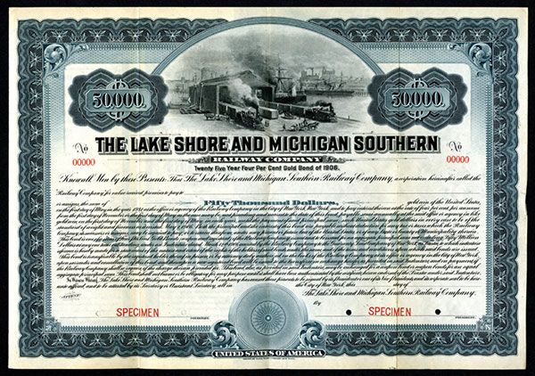 Illinois & Michigan, 1906, $50,000, Specimen 4% Registered Gold Bond, Ship at wharf with trains, black with blue border and underprint, ABNC, POC's, XF. Unlisted railroad in Cox, Rare and very attractive.