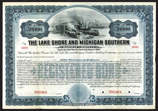 Illinois & Michigan, 1906, $50,000, Specimen 4% Registered Gold Bond, Ship at wharf with trains, black with blue border and underprint, ABNC, POC's, XF. Unlisted railroad in Cox, Rare and very attractive.