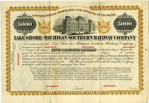 Michigan. 1870, $5000, 7% Consolidated Mortgage and Sinking Fund Bond, Specimen, Black on chestnut brown border and under print, Terminal building in middle, Specimen overprints, POC's, VF condition, Extremely rare as specimen and this example is possibly unique. ABNC.