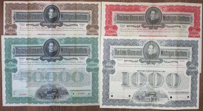 Michigan. Lot includes 4 pieces: $1000 Specimen 3.5% Registered Gold Bond in gray; $5000 Specimen 3.5% Registered Gold Bond in Brown; $10,000 Specimen 3.5% Registered Gold Bond in red; $50,000 Specimen 3.5% Registered Gold Bond in green. All have red specimen overprints, 00000 serial numbers, POCs, and are in Fine condition. ABNC. (4)