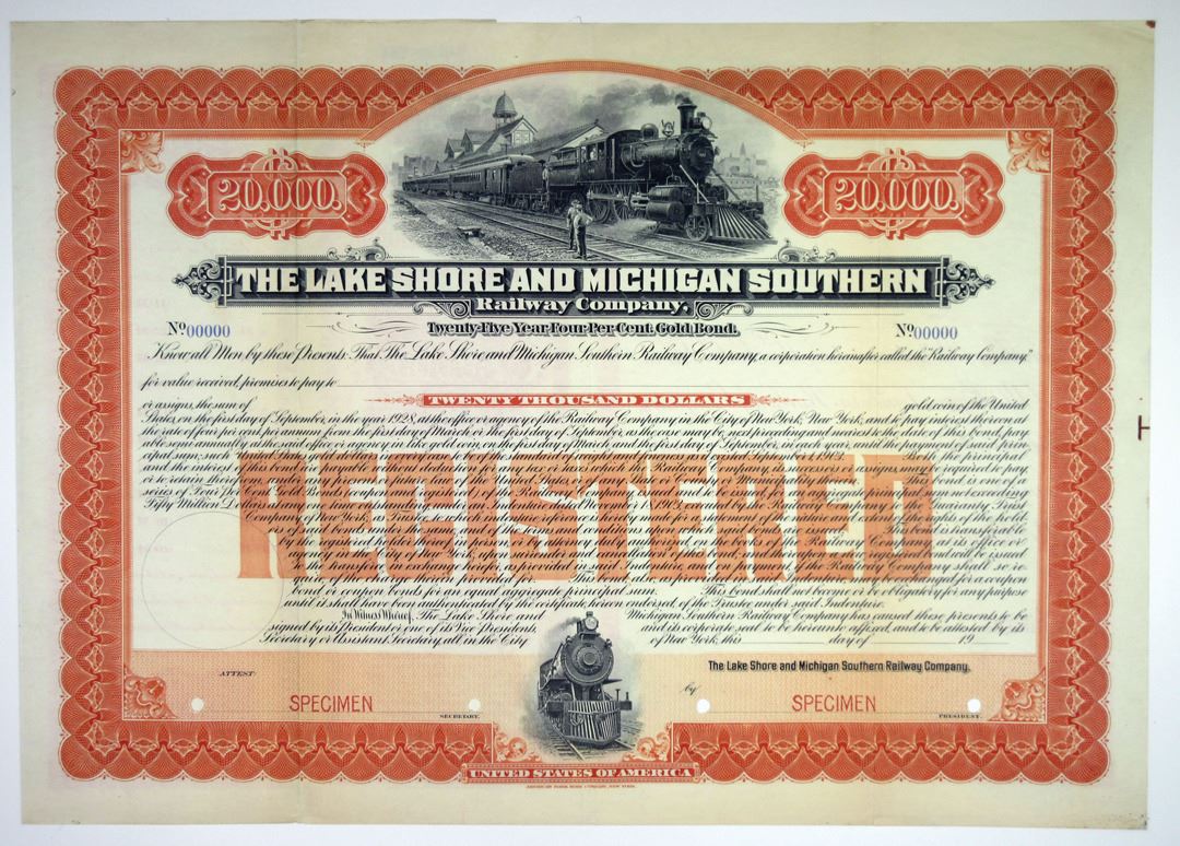 Michigan, 1903, $20,000, Registered Specimen 4% Gold Bond, Orange border with locomotive at station with 2 men on top and locomotive on bottom vignette, POC's, XF, ABNC.