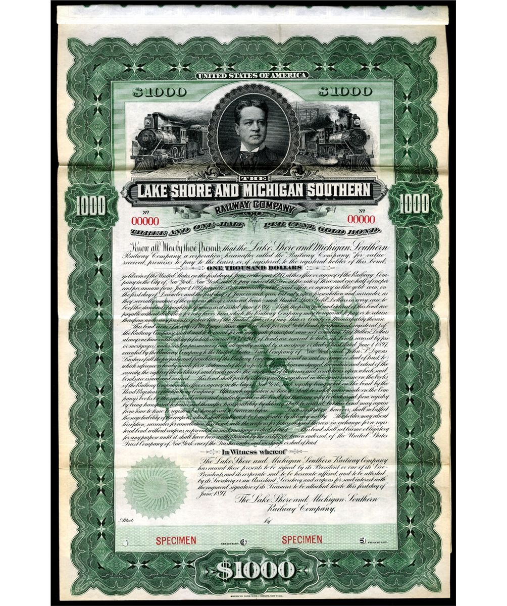 Michigan, $1000, 3 1/2% Gold Bond, Coupons attached, green border, locomotives flank mans portrait, XF condition. ABNC.