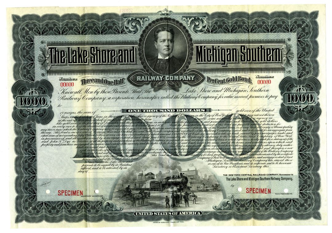 Illinois, Indiana, Michigan, New York, Ohio, & Pennsylvania. $1000 Specimen 3 1/2% Gold Bond, Black print on blue/gray border and under tint on horizontal format, Portrait of company president at top and locomotive at street crossing at bottom, Specimen overprints and POC's, VF-XF condition, ABNC.