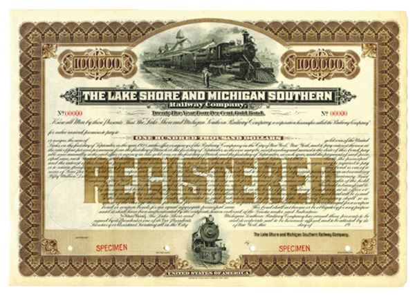 Illinois. $100,000 Specimen 4% Registered Gold Bond, Black print on brown border and under tint in horizontal format, Men at top next to passing locomotive, Specimen overprints and POC's, VF-XF condition, ABNC.