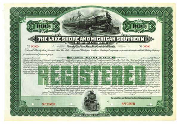 Illinois. $1000 Specimen 4% Registered Gold Bond, Black print on green border and under tint in horizontal format, Men at top next to passing locomotive, Specimen overprints and POC's, VF-XF condition, ABNC.