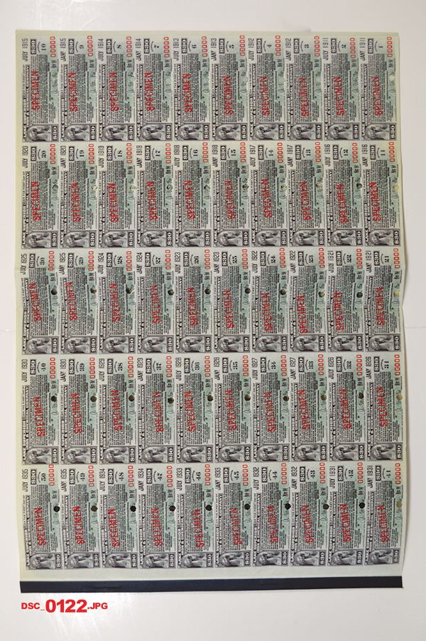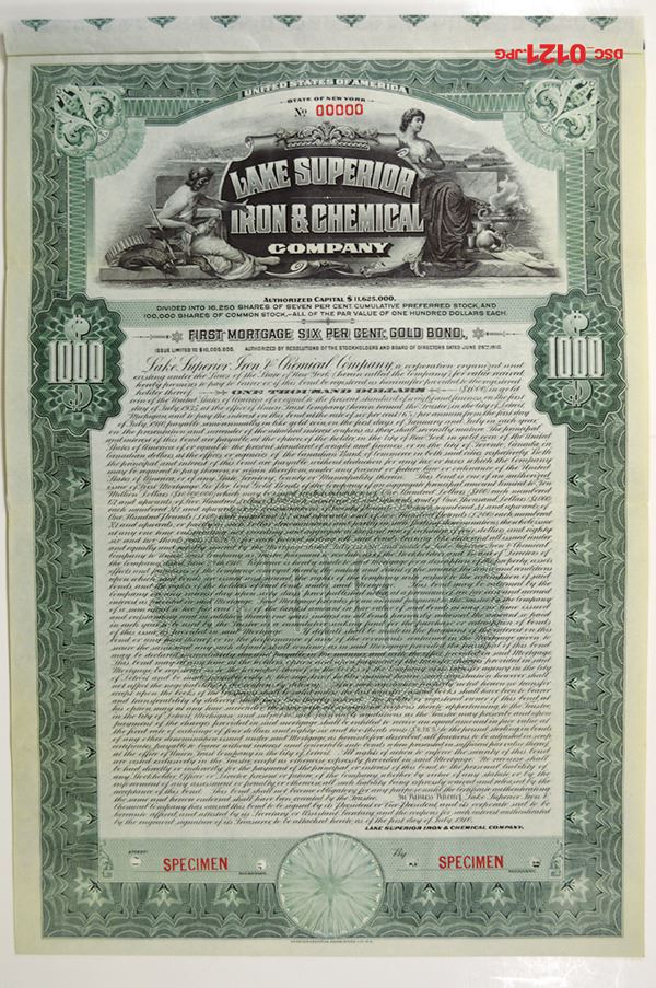 New York. $1000 Specimen 6% 1st Mortgage Gold Coupon Bond, Black print on green border and under tint, Image of allegorical figures standing by company title, Specimen overprints and POC's, VF-XF condition, IBNC.