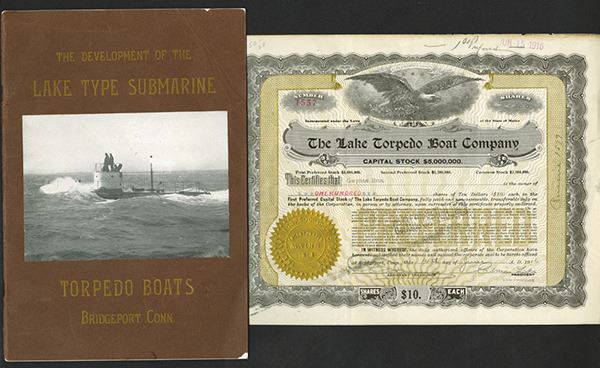 Maine, 1916, 100 Shares, I/C stock certificate signed by Simon Lake, Fine. Simon Lake (1866-1945). *Inventor; Submarine pioneer. Beginning in the early 1890s, and continuing for over 40 years, Lake built a succession of submarines through which he developed some portion of the submarine technology in use today. He is generally credited with developing the first workable periscope, and pioneering the use of hydroplanes fore and aft to achieve submergence while maintaining an even keel. *Winslow & Associates. Also includes booklet on Lake.