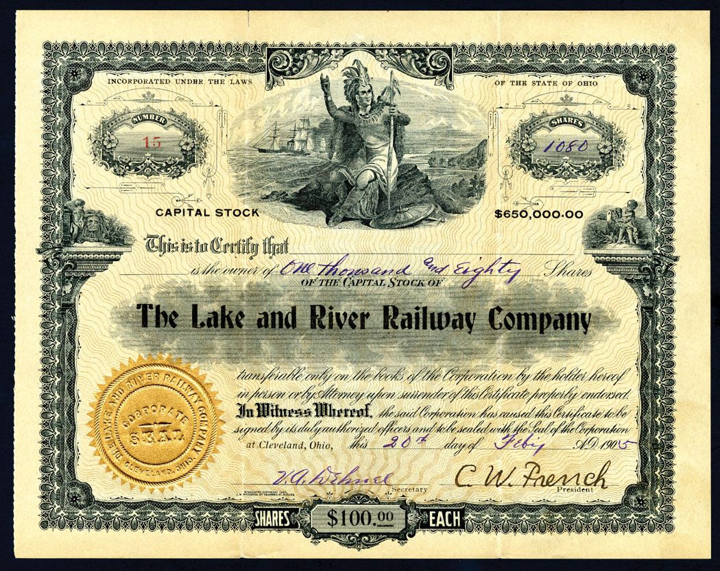 Cleveland, Ohio, 1905, 1080 Shares, Issued and uncancelled, S/N 15, Native American seated with ships behind him, gold seal, No name is written into the owner area but everything else is filled out including embossed corporate seal, the president's signature "C.W. French" and Secretary's signature, VF condition, railroad unlisted in Cox.