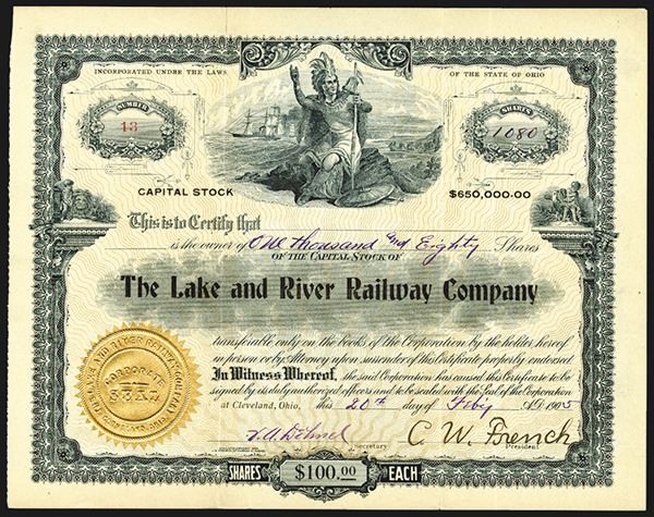 Cleveland, Ohio, 1905, 1080 Shares, Issued and uncancelled but it is not made out to anyone, S/N 13, Native American seated with ships behind him, gold seal, No name is written into the owner area but everything else is filled out including embossed corporate seal, the president's signature "C.W. French" and Secretary's signature, VF condition, rare and first time seen by cataloger, railroad unlisted in Cox.