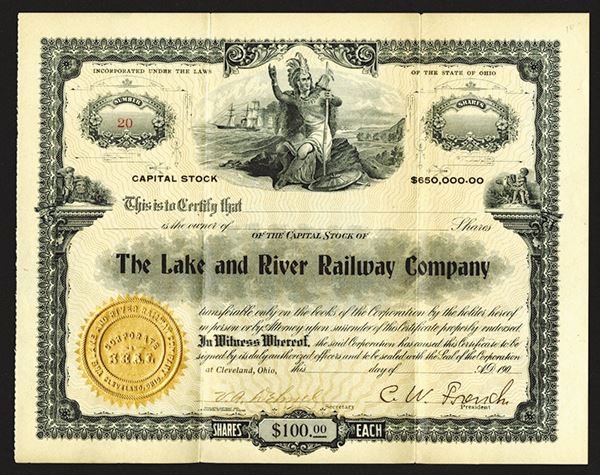 Cleveland, Ohio, Odd Shares, Partially issued, S/N 20, Native American seated with ships behind him, gold seal, No name is written into the owner area but everything else is filled out including embossed corporate seal, the president's signature "C.W. French" and Secretary's signature, VF condition. Rare railroad.