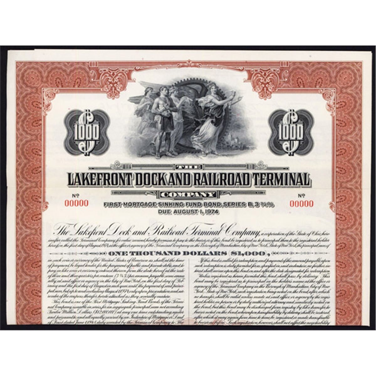 Ohio, 1954, $1000, 1st Mortgage Sinking Fund Bond, Series B, 3 3/4 % Due 1974, Specimen, Coupons attached, Black on burgundy-brown border and underprint, Wheel of progress with allegorical women and man, POC's, XF condition. ABNC, Unlisted railroad in Cox catalog.