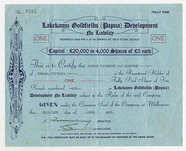 Mines located in Papua and New Guinea (Inc. in Victoria, Australia). 1 Share Issued Stock Certificate, Blue print on blue paper with no border, VF-XF condition.