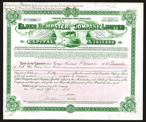 Great Britain. 1) Preference Share Certificate, 1912, light violet underprint, steamship, VF+. 2) 6% Preference Share Certificate, 1914, green with light violet underprint, VF+, notations in the top margin. Founded 132 years ago, the Lamport and Holt Line is one of Liverpool's best known shipping companies; now part of the Vestey group.